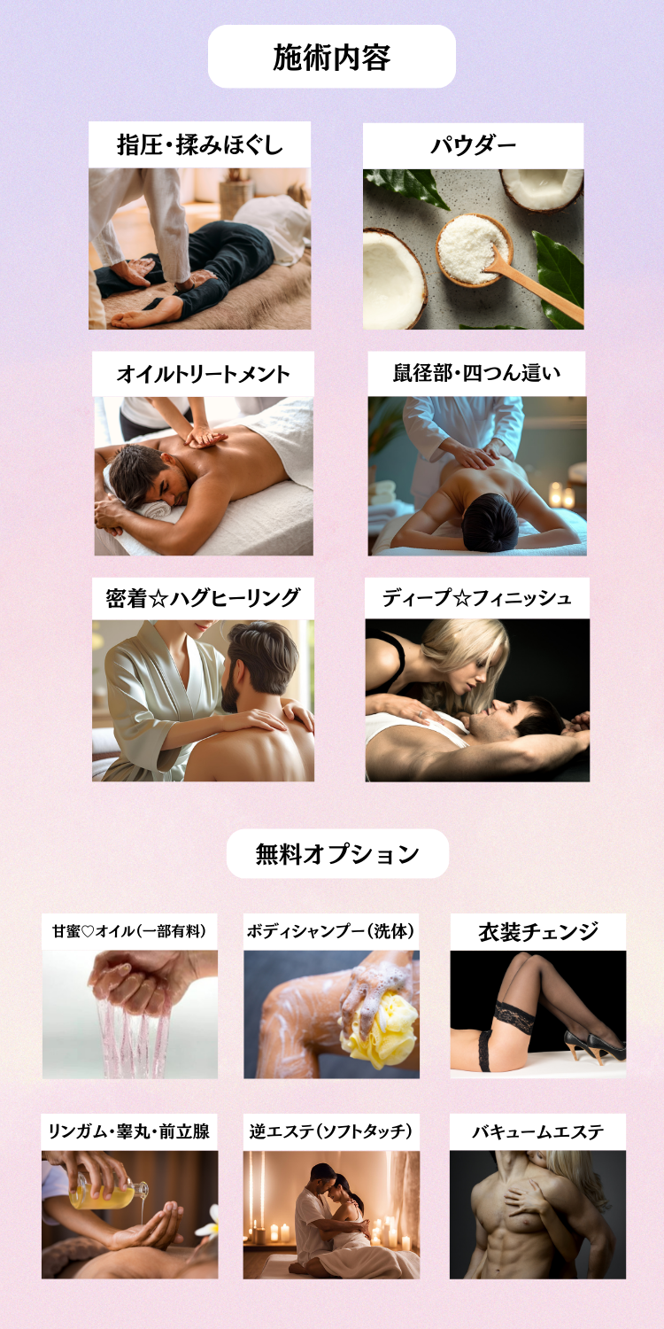 当店について | 究極のメンズエステを追い求めて… ・心落ち着く、密着ハグヒーリング ・頭からつま先までのトリートメント ・男性の聖なる場所(前立腺)、光の杖(男性器) ジャップカサイ(睾丸)などへのアプローチを 主に重視し心身ともに癒しと刺激のある 新感覚のリラクゼーションサロンになります。 認定エステ講師の女性オーナーからの 指導のもと、当店オリジナルトリートメント 幅広いエステティック技術をご提供致しますので 初めての方でも安心してご利用いただけるかと思います。 ワンランク、ツーランク上のエステティック技術に 誠心誠意のおもてなしの空間ご提供させて頂きます。 ◆当店ニューハーフ、男の娘専門の メンズリラクゼーションサロンになりますので ご理解の頂ける方のみご利用をお願い致します。 |